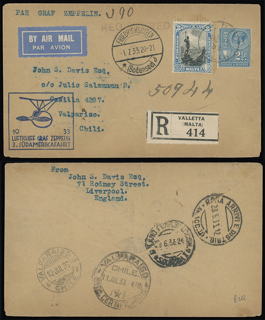 1223 c, entire, etc. imageMalta: Airmails: 1933 (June 25) acceptance for 3rd South America Flight, cover registered to Chile with violet Zeppelin cachet. Sieger 219. Photo. (Image1)