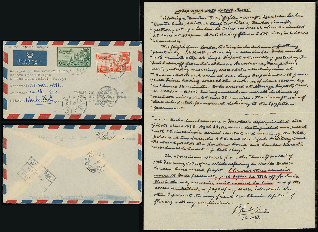 1227 c, entire, etc. imageMalta: Airmails: 1950 cover flown from Egypt to Malta on the record speed flight from London-Luqa-Cairo, by Sqdr. Leader Neville Duke, an interesting item. During the flight he stopped at Luqa where three covers were handed to the pilot. Photo. (Image1)