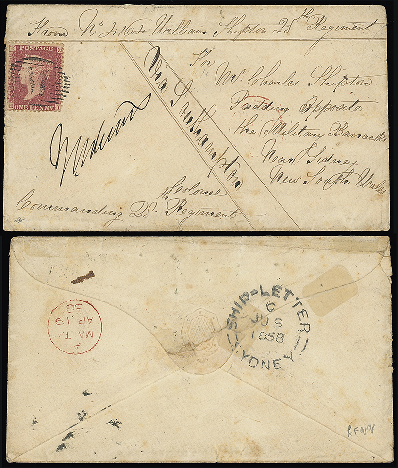 1240 c, entire, etc. imageMalta: Army and Navy Concession Rate Mail: 1858 (Apr. 19) envelope (small blemishes to reverse) to Sydney endorsed “From No. 4164 William Shipton 28th Regiment” and signed by commanding officer at lower left, franked 1857 1d. rose-red plate 59 tied by barred “M” cancellation with Malta c.d.s. and Sydney Ship Letter datestamp on the reverse. Remarkable destination for concession rate mail, the only example among the nine items sent to the Australian colonies during the pre-U.P.U. period recorded by us. Major exhibition item. Ex Dubois. Photo. (Image1)