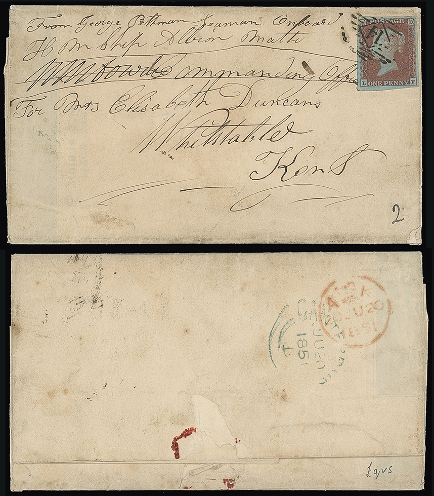1237 c, entire, etc. imageMalta: Army and Navy Concession Rate Mail: 1851 (June 11) entire letter on illustrated HMS Albion letterhead to England endorsed “From George Pethman Seaman on board/H.M.S. Albion Malta” and countersigned by commanding officer, Lieutenant William Dowell, at lower left, franked 1850 1d. red-brown, plate 105 with four very close or large margins, tied by London barred numeral cancellation in transit. Rated “2”(d) as captain’s gratuity and London and Canterbury c.d.s. on the reverse. Addressed to the writer’s sisters asking for a further supply of 1d. stamps for this concession rate. A very early franked cover demonstrating the rate. Ex Coates. Photo. (Image1)