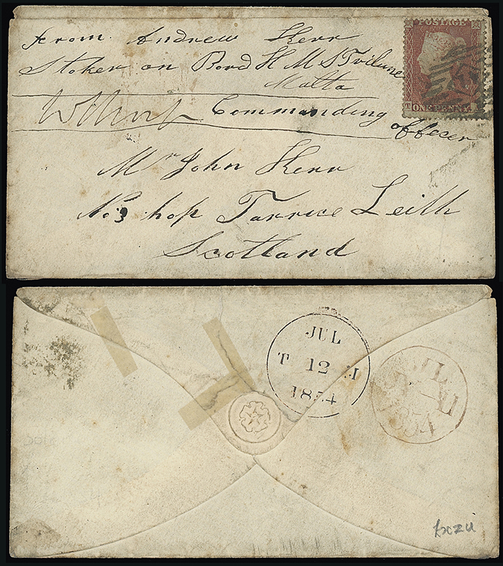 1239 c, entire, etc. imageMalta: Army and Navy Concession Rate Mail: 1854 (June 11) envelope (a few blemishes) to Leith endorsed “From Andrew Kerr/Stoker on board H.M.S. Tribune/ Malta”, countersigned by commanding officer below and franked 1854 1d. red-brown die I, alphabet II tied by London barred numeral cancellation in transit. London and Edinburgh transit c.d.s’s on the reverse. Photo. (Image1)