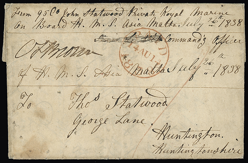 1232 c, entire, etc. imageMalta: Army and Navy Concession Rate Mail: 1838 (July 26) entire letter on illustrated (Naval Hospital on Malta Harbour) letterhead to England endorsed “From 95 Co. John Statwood Private Royal Marine/on board H.M.S. Asia Malta July 26th 1838”, countersigned by commanding officer below and rated “1”(d), cancelled in transit. London Paid and London arrival datestamps on the front or the reverse, circular pinholes at lower left indicating a 1d. coin sewn in as prepayment, very scarce. Photo. (Image1)