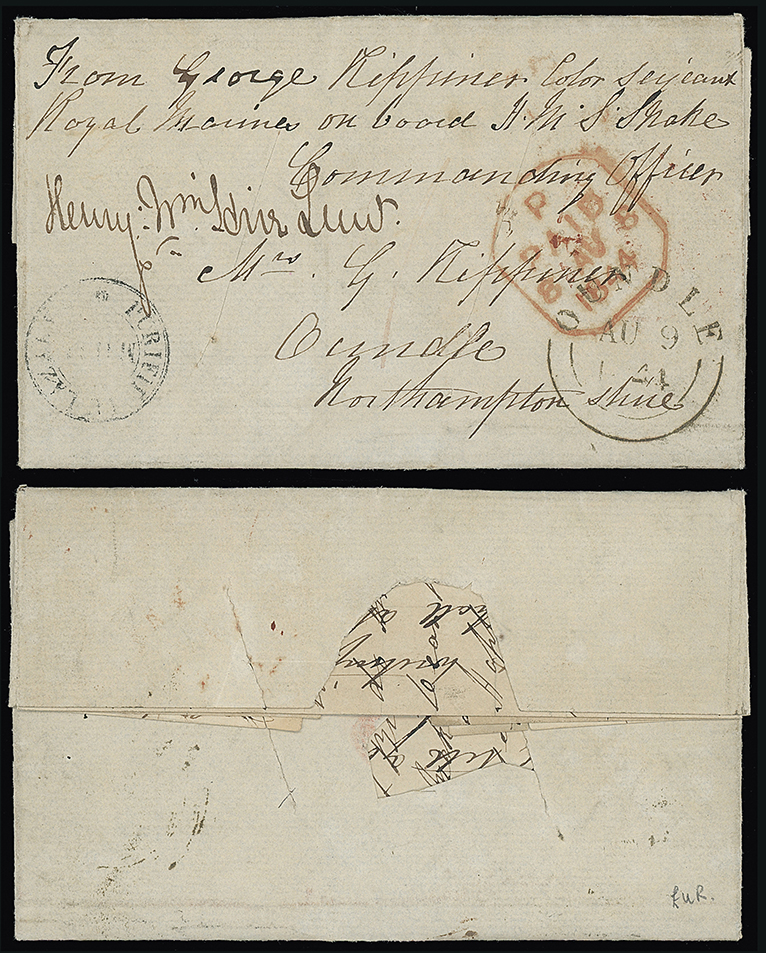 1233 c, entire, etc. imageMalta: Army and Navy Concession Rate Mail: 1844 (June 20) entire letter (extensive and cross-written, datelined “Coast of Syria”) to England endorsed “From George Rippiner, Colour Sergeant/Royal Marines on board H.M.S. Snake” (subsequently wrecked in 1847) countersigned by commanding officer below and very faintly rated “1”(d), sent via Malta with two disinfection slits and with “PURIFIE AU LAZARET/MALTE”, London transit and Oundle arrival datestamps. Carried on the “Lady Mary Wood” from Malta to Southampton. Photo. (Image1)