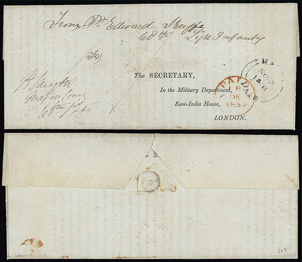 1238 c, entire, etc. imageMalta: Army and Navy Concession Rate Mail: 1853 (Nov. 23) printed entire (requesting information regarding the writer’s brother(?) to the Secretary of the Military Department at East India House in London, headed “From Pte Edward Keffe, 68th Light Infantry” at top, endorsed by commanding officer at lower left and rated “1”(d), London and Malta datestamps. Scarce internal military correspondence at the concessionary rate. Ex Grabfield. Photo. (Image1)