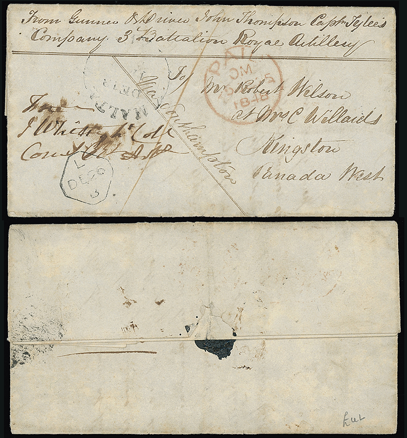 1236 c, entire, etc. imageMalta: Army and Navy Concession Rate Mail: 1848 (Dec. 11) entire “via Southampton” to Kingston, Canada datelined at Fort St Elmo and endorsed “From Gunner & Driver John Thompson Captn Tylee’s/Company 3rd Battalion Royal Artillery” and countersigned by commanding officer at lower left and with Malta, London and Liverpool datestamps and rated “1”d), Carried on the “Indus” to Southampton and “America” from Liverpool to Halifax. Remarkable destination for military concession mail. Ex Steinhart. Photo. (Image1)