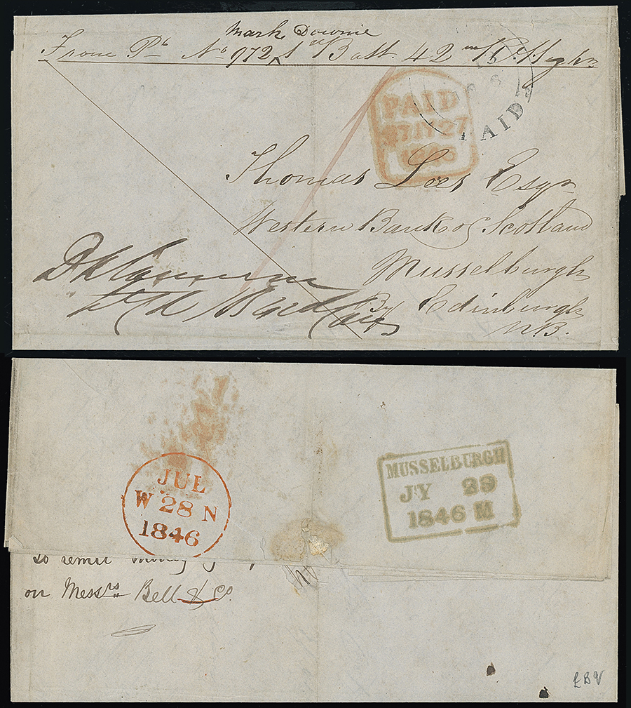 1235 c, entire, etc. imageMalta: Army and Navy Concession Rate Mail: 1846 (July 11) entire letter to Musselburgh endorsed “From Pte Mark Downie No. 972 1st Battalion 42nd Royal Highland Rgt”, countersigned by commanding officer at lower left and with Malta and London tombstone datestamps and rated “1”(d). Edinburgh and Musselburgh c.d.s. on the reverse. Carried on the P&O “Oriental” to Southampton. Ex Rogers. Photo. (Image1)