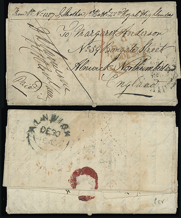 1234 c, entire, etc. imageMalta: Army and Navy Concession Rate Mail: 1845 (Dec. 12) entire letter datelined at Vittoriosa to England endorsed “From Pte No. 1227 J. Strother 1st Battalion 42nd Royal Highlanders”, countersigned by commanding officer at lower left and with Malta and London datestamps and rated “1”(d)., with Alnwick c.d.s. on the reverse. Carried on the P&O “Great Liverpool” to Southampton. Photo. (Image1)