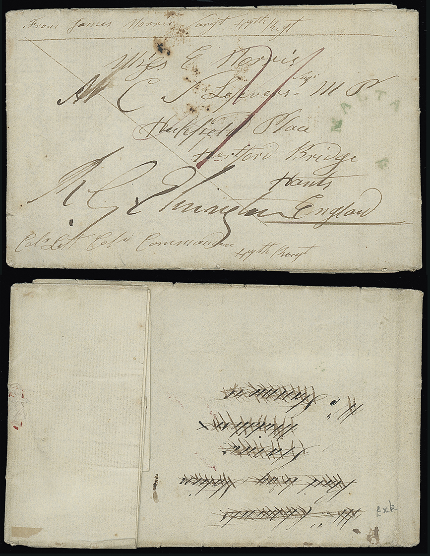 1231 c, entire, etc. imageMalta: Army and Navy Concession Rate Mail: 1837 (July 28) entire letter to England endorsed “From James Norris Sargt 47th Rgt (of Foot)”, countersigned by commanding officer at lower left and with undated “MALTA/F” (applied at Falmouth) in green. Addressed to the writer’s sister reminding her to “pay one penny” when she replies to him. Photo. (Image1)