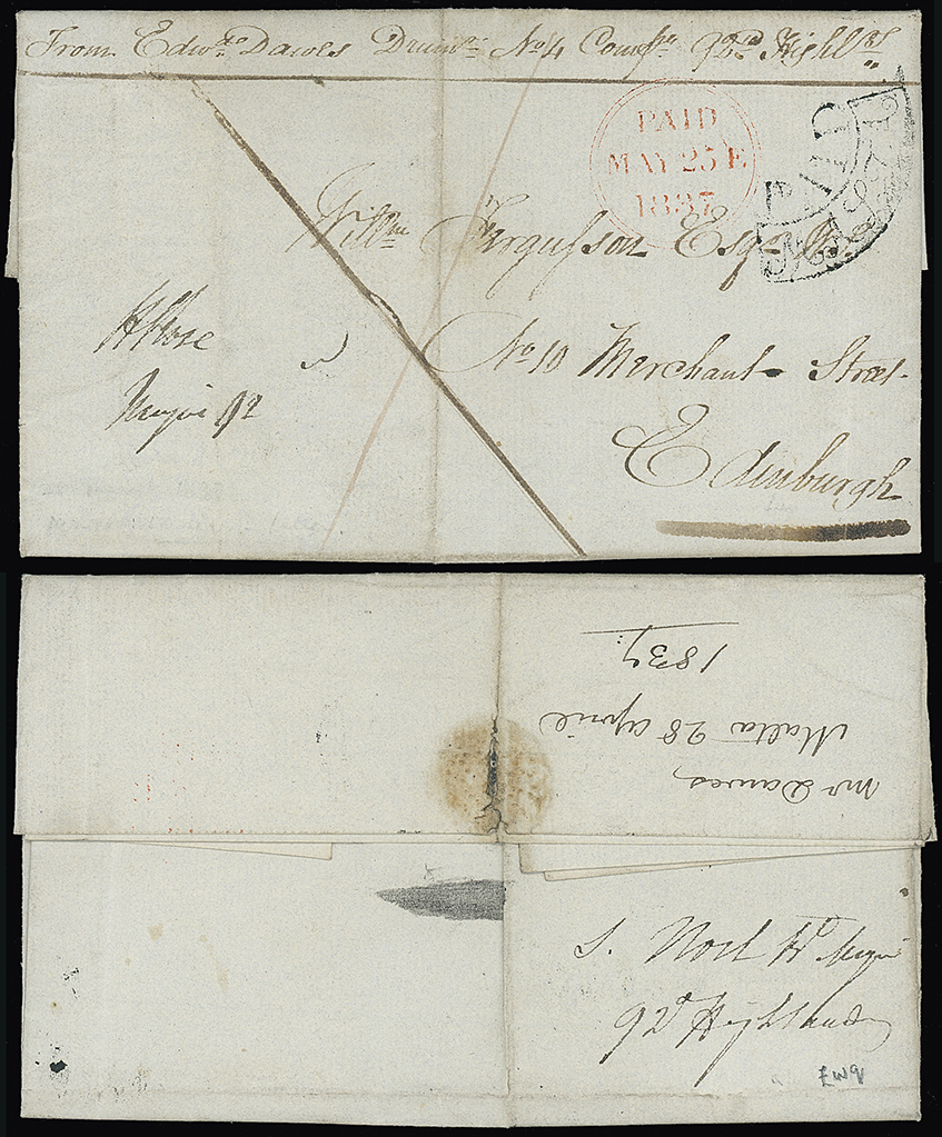 1230 c, entire, etc. imageMalta: Army and Navy Concession Rate Mail: 1837 (Apr. 28) entire letter (file fold) to Edinburgh endorsed “From Edwrd Dawes, Drummer, No. 4 Company 92nd Highlanders”, countersigned by commanding officer at lower left and with black scroll “PAID/MALTA” and Edinburgh “PAID” c.d.s. Carried on the Admiralty packet HMS “Blazer”. Note: The Gordon Highlanders were stationed at Floriana but were later moved due to a cholera outbreak which later led to seven deaths. Photo. (Image1)