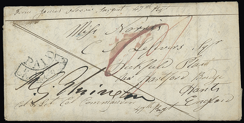 1229 c, entire, etc. imageMalta: Army and Navy Concession Rate Mail: 1837 (Apr. 10) entire letter (file fold) to England endorsed “From James Norris Sargt 47th Rgt (of Foot)”, countersigned by commanding officer at lower left and with black scroll “PAID/MALTA”, addressed to the writer’s sister and carried on HMS “Blazer” to Falmouth. Ex De Boer. Photo. (Image1)