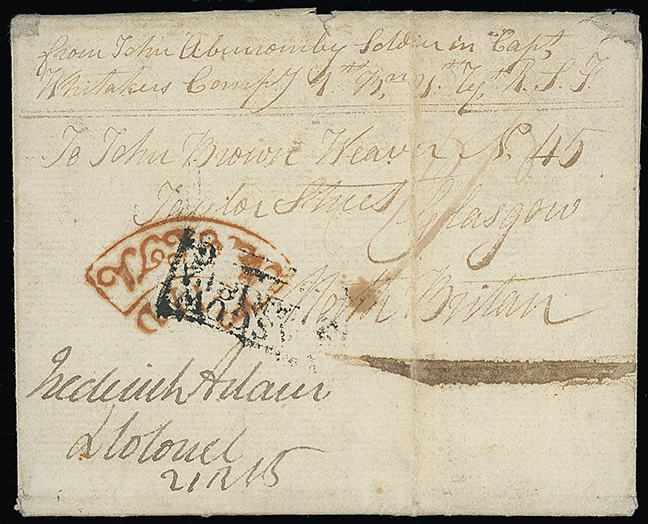 1228 c, entire, etc. imageMalta: Army and Navy Concession Rate Mail: 1812 (Jan. 3) entire letter (file fold) to Glasgow endorsed “From John Abercromby Soldier in Capt/Whitaker’s Company 1st Battalion 21st R(oyal) S(cots) F(usiliers)”, countersigned by commanding officer at lower left and with red scroll “PAID/MALTA” mark and framed Glasgow arrival datestamp. The letter (typed transcript included) to the writer’s father and brother and datelined at Messina (London G.P.O. Instruction of Aug. 13 1811 extended privilege to forces in Sicily who remained active there during the Napoleonic Wars) “...the inhabitants of this place had formed a conspiracy against us and was [sic] intending to have carried off our Gun Boats to the French...” and “The milk and butter is (sic) very dear but we use olive oil instead....” and probably carried on “Princess Charlotte” to Falmouth. Important insight into the Peninsular campaign. Ex Sattin. Photo. (Image1)