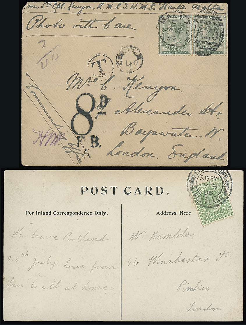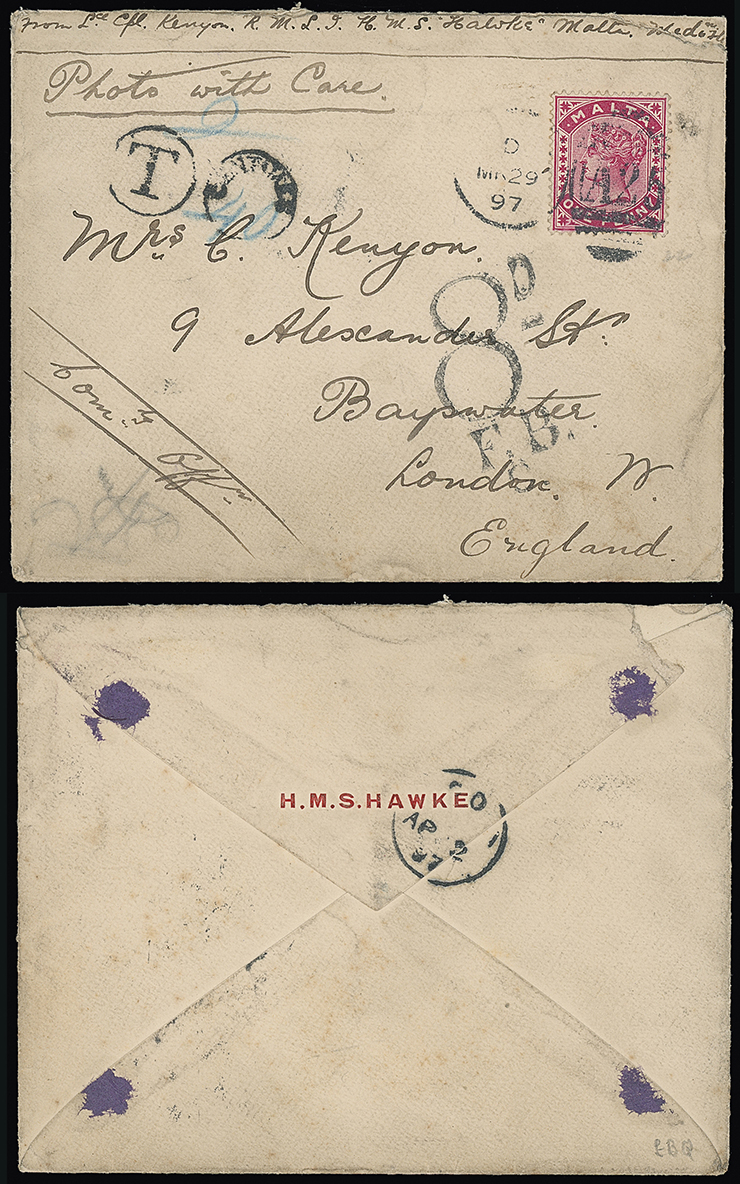 1261 c, entire, etc. imageMalta: Army and Navy Concession Rate Mail: 1897 (Jan. 15) envelope (flap fault) to London endorsed “From Lce. Corporal Kenyon R.M.L.I. H.M.S Hawke Malta” and “Photo with care” countersigned by commanding officer at lower left, franked 1885 1/2d. green pair tied by “A25” duplex and taxed as content disallowed with circular “T/CENTIMES ‘40’” mark and London Foreign Branch “8D/F.B.” mark, unusual, with part “PADDINGTON W.” c.d.s. on the reverse also real-photographic postcard of the ship sent from Portland in 1905. “Hawke” was an early victim in World War I, torpedoed and sunk in the North Sea on Oct. 15 1914 by German submarine U-9. (2 items) Ex Disraeli, Eastgate and Swarbrick. Photo. (Image1)