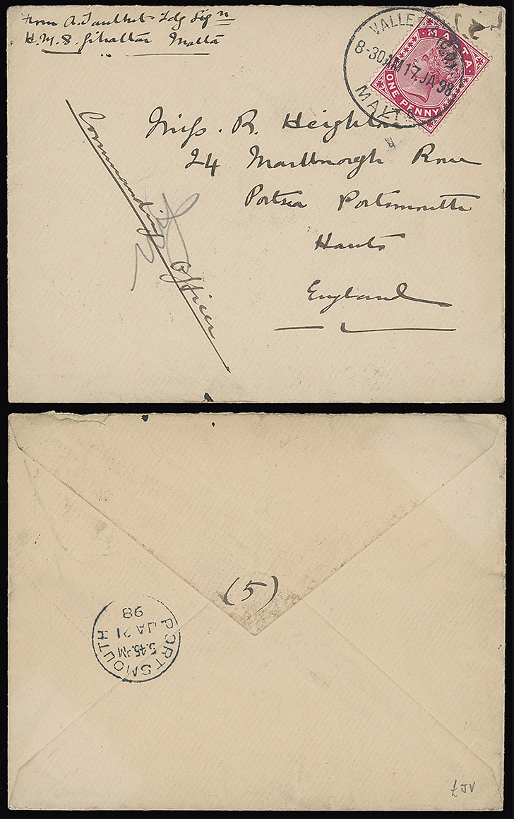 1266 c, entire, etc. imageMalta: Army and Navy Concession Rate Mail: 1898 (Jan. 17) envelope to Portsmouth endorsed “From A. Taulbet Ldg Sign/H.M.S Gibraltar Malta” and countersigned by commanding officer at lower left, franked 1885 1d. carmine tied by Valletta c.d.s. and with Portsmouth arrival c.d.s. on the reverse. Photo. (Image1)