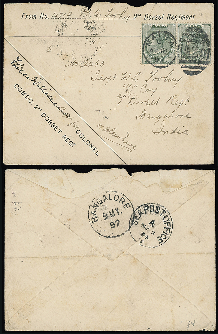 1263 c, entire, etc. imageMalta: Army and Navy Concession Rate Mail: 1897 (Apr. 18) printed “2nd Dorset Regiment” envelope (roughly opened) to India franked 1885 1/2d. green pair tied by “A25” duplex, endorsed and countersigned by commanding officer at left. With Sea Post Office and Bangalore c.d.s’s on the reverse, unusual destination and franking. Photo. (Image1)
