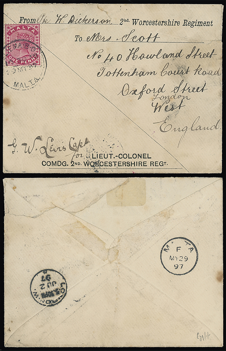 1264 c, entire, etc. imageMalta: Army and Navy Concession Rate Mail: 1897 (May 29) printed “2nd Worcestershire Regiment” envelope (small faults) to London franked 1885 1d. carmine tied by Sliema B.O. c.d.s., endorsed and countersigned by commanding officer at left. With Malta and London W. c.d.s’s on the reverse. Photo. (Image1)
