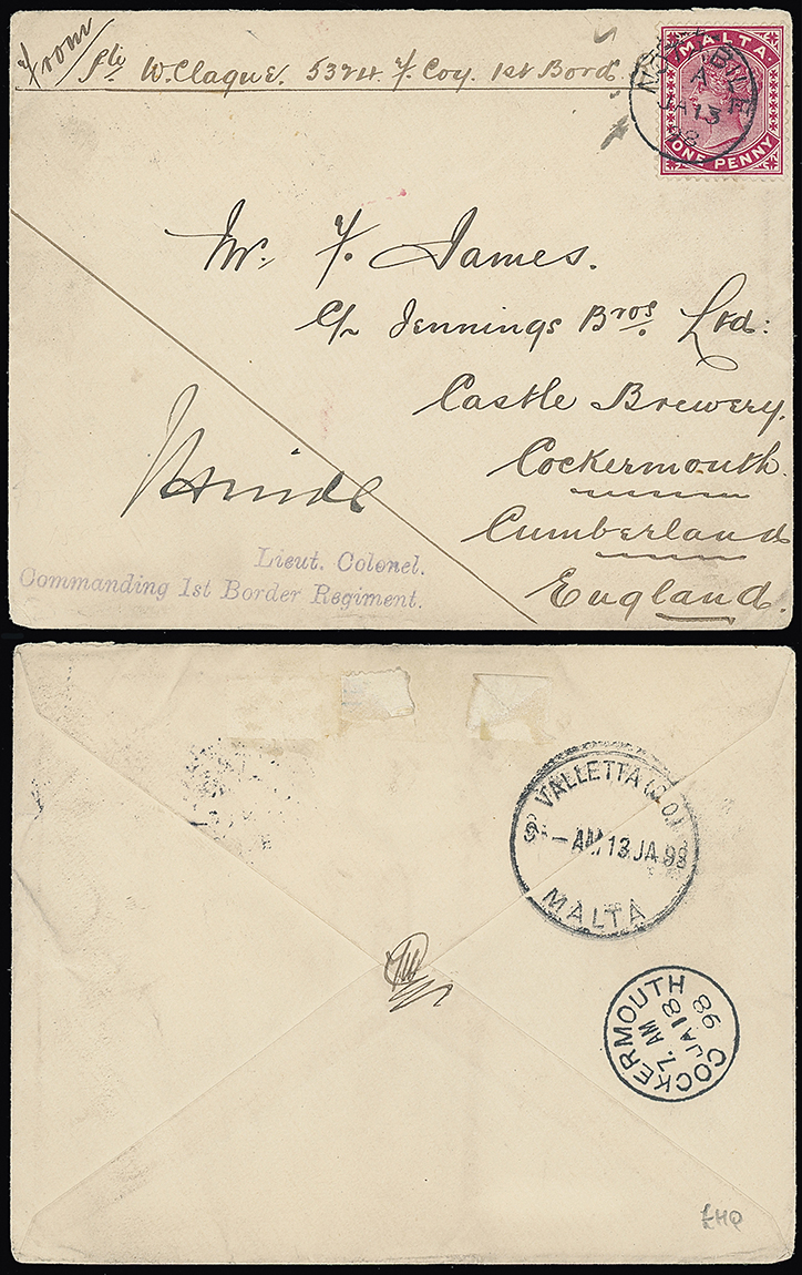 1265 c, entire, etc. imageMalta: Army and Navy Concession Rate Mail: 1898 (Jan. 13) envelope to England franked 1885 1d. carmine tied by Notabile c.d.s., endorsed “From Pte W.Clague, 5324, F Coy 1st Borders Regiment” and countersigned by commanding officer at left. With Valletta and Cockermouth c.d.s’s on the reverse. Ex Coates. Photo. (Image1)