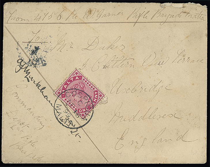 1267 c, entire, etc. imageMalta: Army and Navy Concession Rate Mail: 1899 (Feb. 16) envelope (slight toning) to England franked 1885 1d. carmine tied by Cospicua c.d.s., endorsed “From 4756 Pte W.Garner, Rifle Brigade Malta” and countersigned by commanding officer at left. With Malta transit and Uxbridge arrival c.d.s. on the reverse. Photo. (Image1)
