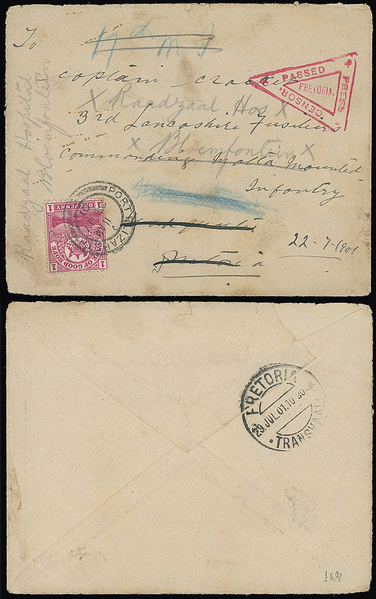 1268 c, entire, etc. imageMalta: Army and Navy Concession Rate Mail: 1901 (July 23) envelope to Pretoria franked Cape Of Good Hope 1d. tied by Port Elizabeth c.d.s. addressed to a Captain Crocket “Commanding Malta Mounted Infantry”, redirected to Raadzaal Hospital, Bloemfontein and with triangular Pretoria censor mark. The only example of mail to a member of the Malta Mounted Infantry in the Boer War. Ex Hart. Photo. (Image1)