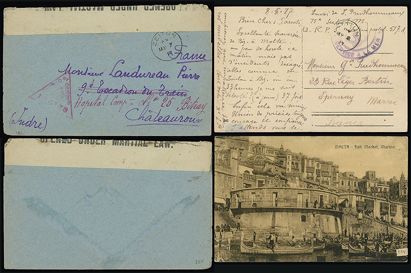 1275 c, entire, etc. imageMalta: World War I: French Navy at Malta, 1917 (May 7) unfranked envelope to France with “OPENED UNDER MARTIAL LAW” reseal tape at top and with Zeitun c.d.s. and triangular “4178” censor mark and 1917 (May 8) postcard to France with Zeitun c.d.s. and double ring violet rubber “MARINE FRANCAISE SERVICE A LA MER” cachet, the latter ex Eastgate. (2 items) Photo. (Image1)