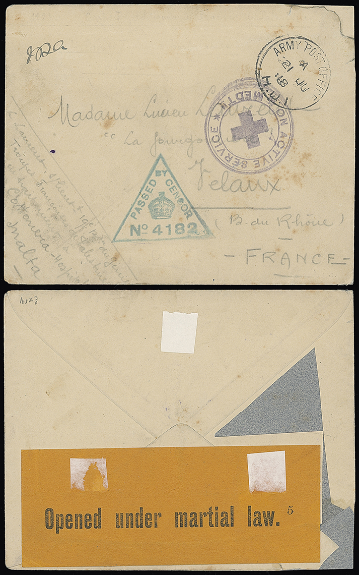 1276 c, entire, etc. imageMalta: World War I: French Navy at Malta, 1918 (June 21) envelope (small repair) with “ARMY POST OFFICE/H.D.1” c.d.s., “ON ACTIVE SERVICE/MEDTn.” cross cachet in violet and with a triangular “No 4182” censor mark in blue-green. The envelope endorsed at lower left by a sub-lieutenant in the 19th Regiment whilst at Corradino Hospital, scarce. Photo. (Image1)