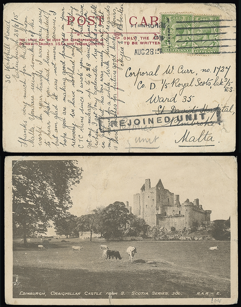 1280 c, entire, etc. imageMalta: World War I: Hospitals, 1915 (Aug. 28) picture postcard to a corporal at St David’s Hospital franked G.B. 1/2d. (2) tied by Edinburgh machine cancellation and with scarce framed “REJOINED UNIT” mark. Photo. (Image1)