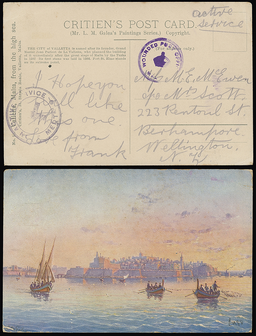 1278 c, entire, etc. imageMalta: World War I: Hospitals, 1915 picture postcard to New Zealand endorsed “Active Service” with rare violet double ring “WOUNDED POST OFFICE/(crown)/MALTA.” mark and a grey-blue double ring “ON ACTIVE SERVICE MEDT.” mark (OAS-6g) applied at St Andrew’s Hospital. Photo. (Image1)