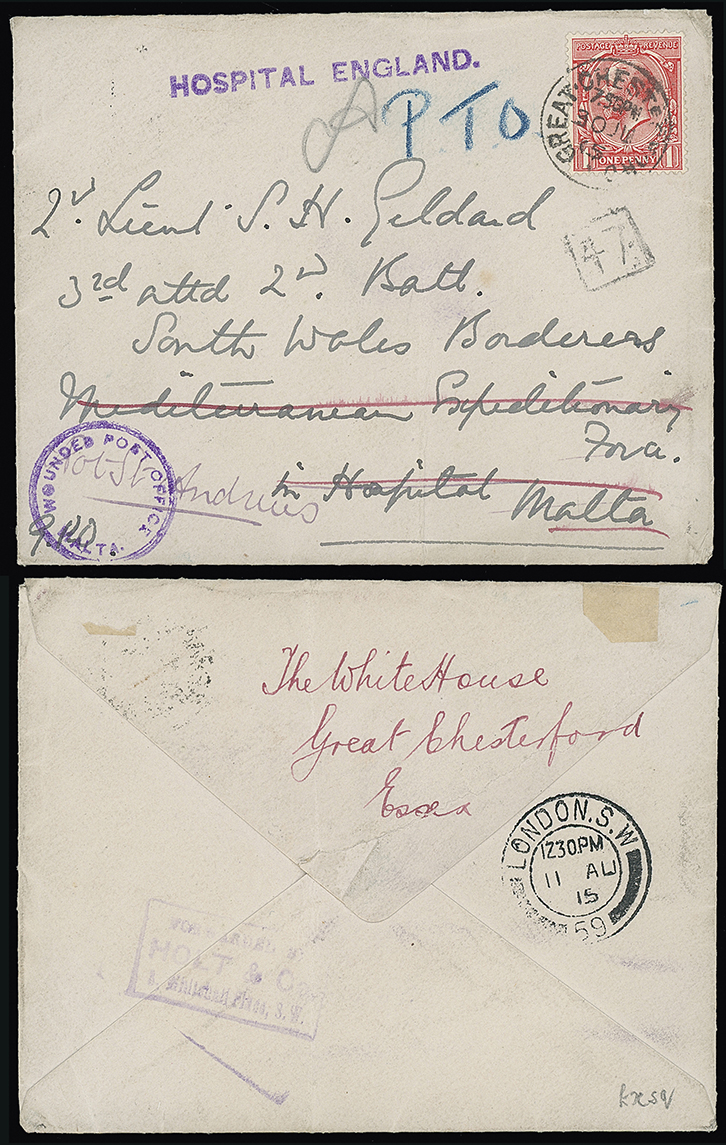 1279 c, entire, etc. imageMalta: World War I: Hospitals, 1915 (June 30) envelope to a lieutenant at St Andrew’s Hospital franked G.B. 1d. tied by Great Chesterfield c.d.s. with rare violet double ring “WOUNDED POST OFFICE/MALTA.” mark (no visible crown in centre) and apparently redirected with straight line “HOSPITAL ENGLAND.” mark at top and with a forwarding agents mark and London transit c.d.s. on the reverse. Ex Disraeli and Eastgate Photo. (Image1)