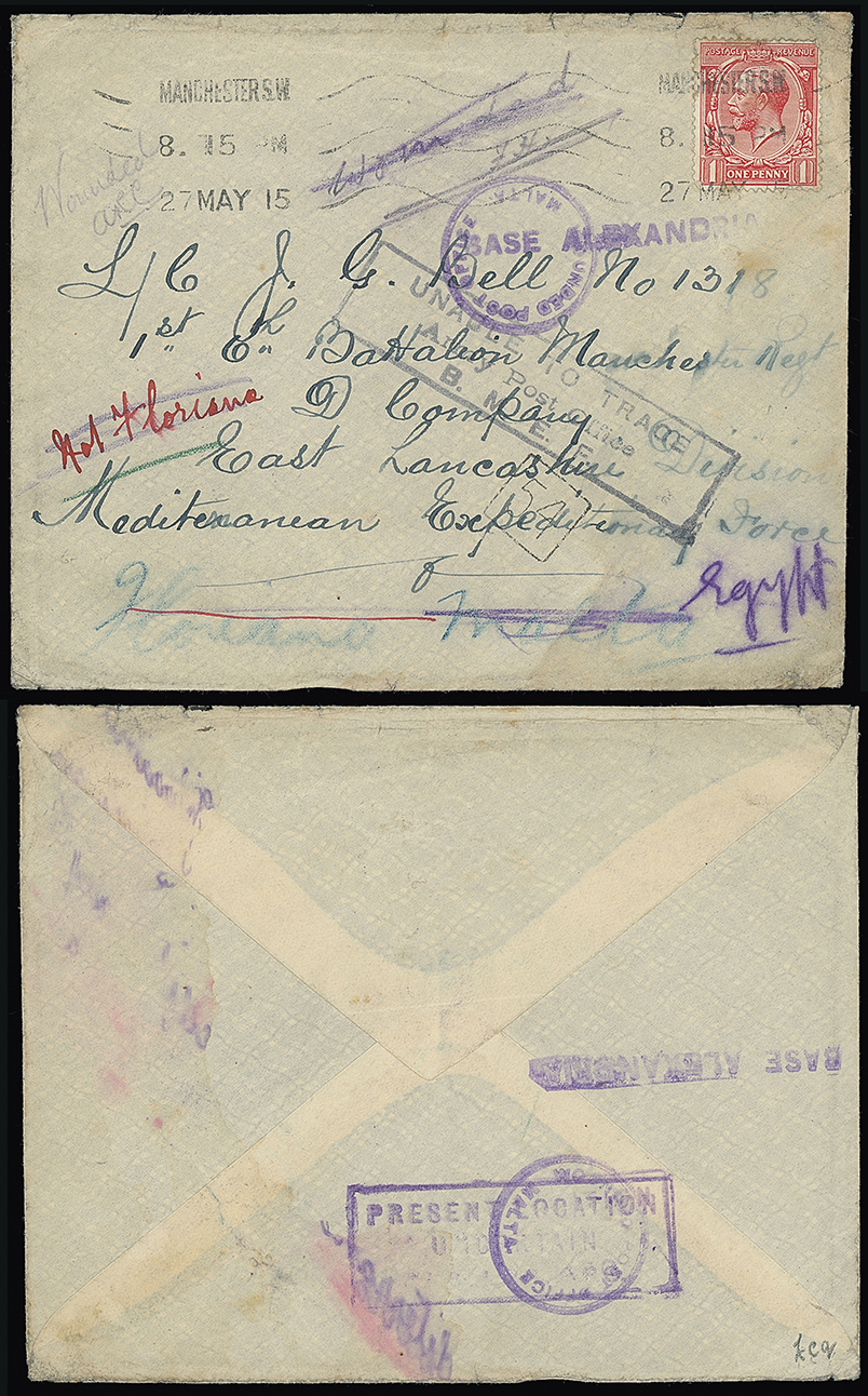 1269 c, entire, etc. imageMalta: World War I: 1915 (May 27) envelope to the Mediterranean Expeditionary Force franked G.B 1d. tied by Manchester machine cancellation, redirected to Floriana and endorsed “Not Floriana” and “Wounded” with violet double ring “WOUNDED POST OFFICE/MALTA” (no visible crown mark), redirected to Egypt with “BASE ALEXANDRIA” mark on front and the reverse, framed “UNABLE TO TRACE/Army Post Guide/B.M.E.F” and framed “PRESENT LOCATION/UNCERTAIN” on reverse; dramatic cover. Photo. (Image1)