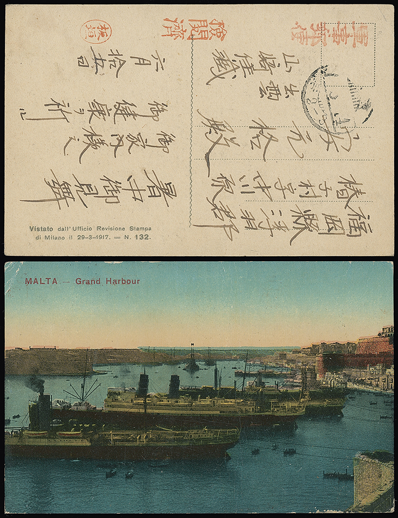 1270 c, entire, etc. imageMalta: World War I: 1918 (June 15) picture postcard (Malta Harbour) to Nakagawara Fukuoka Prefecture, Japan from Komo Yamazaki on board HIJMS “Izumo” (Japanese Naval armoured cruiser and flagship of the 2nd Special Mission Squadron) operating in the Mediterranean from 1917-19 escorting troop transports carrying reinforcements to France, rare. Photo. (Image1)