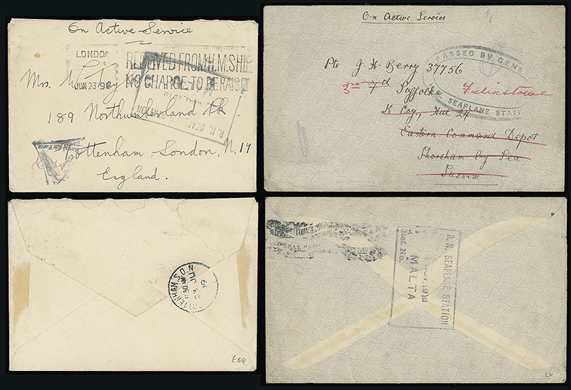 1272 c, entire, etc. imageMalta: World War I: 1918 (Nov. 1) envelope “On Active Service” to England with double oval “PASSED BY CENSOR/H.M.SEAPLANE STATION” mark and framed “R.N.SEAPLANE STATION/(date)MALTA/Ref No.” datestamp on the reverse and 1919 (May) envelope “On Active Service” to London with framed “R.N.SEAPLANE STATION/(date)MALTA/Ref No.”, triangular censor mark and “LONDON/DATE/RECEIVED FROM H.M.SHIP/NO CHARGE TO BE RAISED” mark, fine. (Image1)
