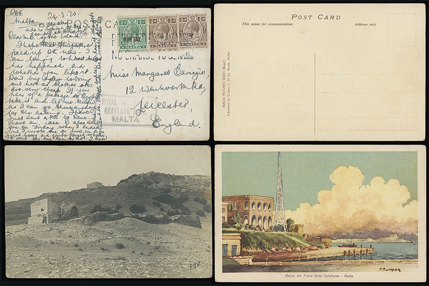 1273 c, entire, etc. imageMalta: World War I: 1920 (Mar. 24) picture postcard to Leicester franked 1/4d. (2) and 1/2d. ‘WAR TAX’ tied by “RECEIVED FROM HM SHIPS/NO CHARGE TO BE RAISED” mark and with framed “ROYAL AIR FORCE/SEAPLANE BASE/MALTA” mark also a picture postcard depicting the base. (2 items) Photo. (Image1)