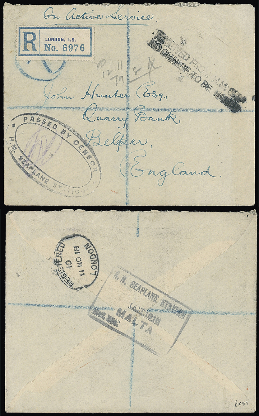 1271 c, entire, etc. imageMalta: World War I: 1918 (Oct.) envelope “On Active Service” to England with double oval “PASSED BY CENSOR/H.M.SEAPLANE STATION” mark and framed “R.N.SEAPLANE STATION/(date)MALTA/Ref No.” datestamp on the reverse with manuscript blue cross and circular “R” mark and printed “LONDON I.S.” (Inland Section) registration label affixed and “RECEIVED FROM HM SHIP/NO CHARGE TO BE RAISED” mark, very unusual. Photo. (Image1)