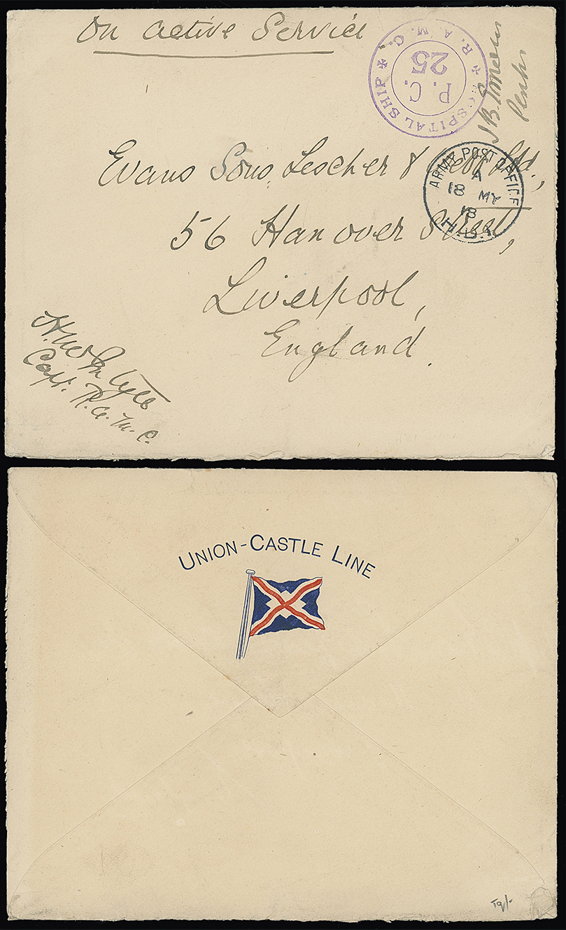 1277 c, entire, etc. imageMalta: World War I: Hospitals Ships, 1915-16 used picture postcards depicting His Majesty’s Hospital Ships incl. “Dongola”, “Valdivia”, “Letitia” (with a large double oval “H.M.HOSPITAL SHIP/No..../Date.../”LETITIA”” cachet on the address side, “Braemar Castle”, “Warilda”, “Marama” (with double framed “ON ACTIVE SERVICE/N.Z.Hospital Ship/”MARAMA”” mark on address side), 1918-19 postcards or cover with double ring “HOSPITAL SHIP/P.C./3/R.A.M.C.” (believed “H.M.S GLOUCESTER CASTLE”) or “25” (identity unknown) cachets on each, two postcards or censored cover from or depicting the “FORMOSA” and a 1915 postcard to Marseille with French “HOPITAL CHIRUGICAL FLOTTANT/DU C.E.O.” mark on address side, a rare group. (13) (Image1)