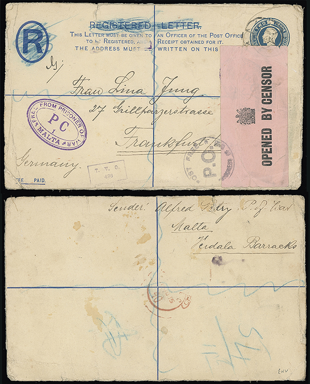 1287 c, entire, etc. imageMalta: World War I: P.O.W Mail: 1915 (Aug.) 2d. registration envelope (size H, with “REGISTERED LETTER” deleted, presumably due to a shortage) to Frankfurt from an Alfred Petry at Verdala Camp with pink censor tape affixed and tied by “POST FREE/P.C.PRISONER OF WAR” cachet and double oval “FREE FROM PRISONER OF WAR/P.C./1/MALTA” cachet in violet, scarce. Photo. (Image1)