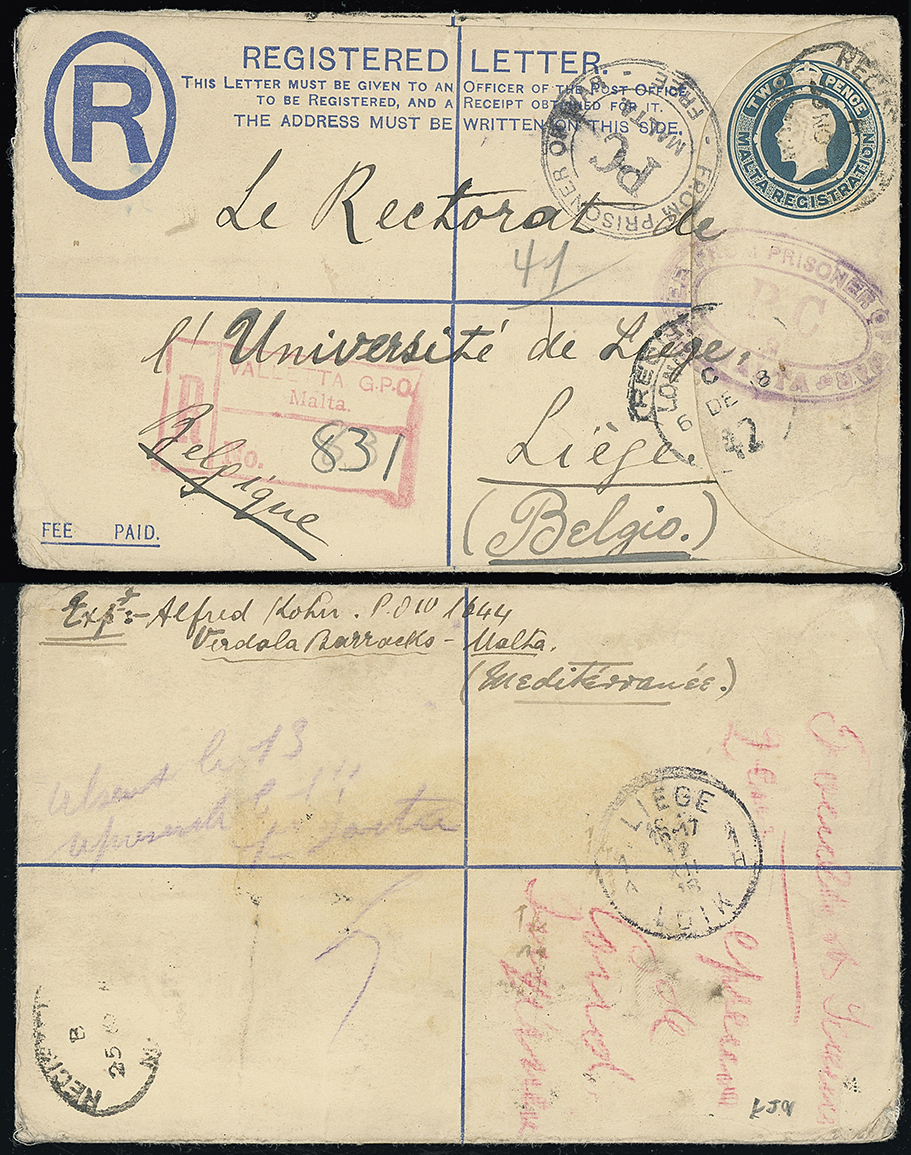 1288 c, entire, etc. imageMalta: World War I: P.O.W Mail: 1918 (Nov. 25) 2d. registration envelope (size G, use permitted after the war ended) to Liege from an Alfred Kohn (Austrian National) at Verdala Camp with framed Valletta registration mark, double ring “FREE FROM PRISONER OF WAR*MALTA*PC/MALTA” in black and double oval “FREE FROM PRISONER OF WAR/P.C./1/MALTA” cachet in violet and a London hooded transit datestamp, scarce. Photo. (Image1)