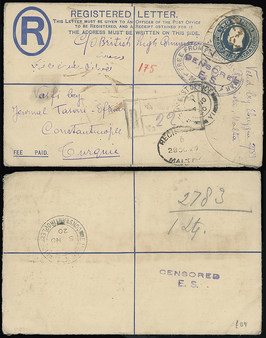 1289 c, entire, etc. imageMalta: World War I: P.O.W Mail, 1920 (Oct. 28) 2d. registration envelope (size G, use permitted after the war ended) to Constantinople from an Ebuzzia Velid (a former Baghdad Governor) at Polverista Camp with framed Valletta registration mark and double oval “FREE FROM PRISONER OF WAR/P.C./4/MALTA” cachet in violet, overstruck by “CENSORED/E.S.” with oval “REGISTERED/MALTA” datestamps and double ring “BASE POST OFFICE/YI” and British P.O. in Constantinople arrival c.d.s. on the reverse. Photo. (Image1)