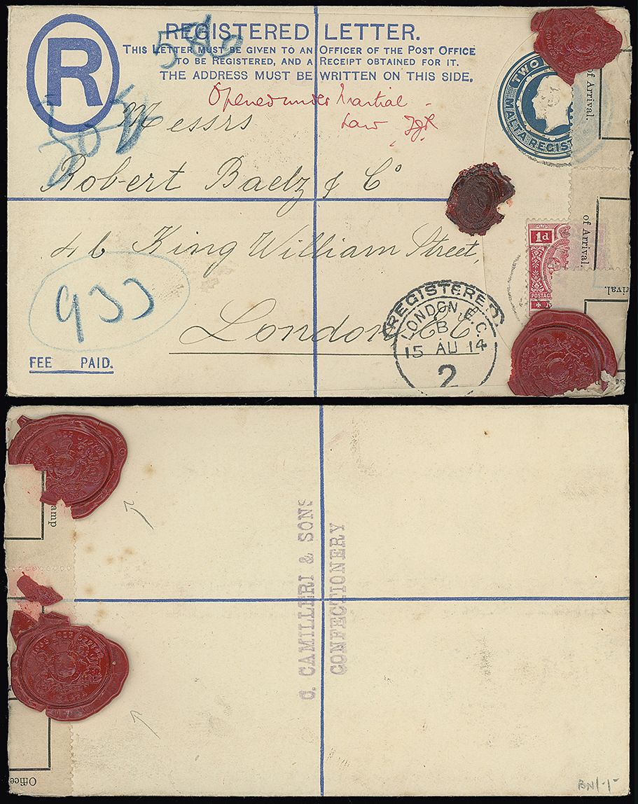 1293 c, entire, etc. imageMalta: World War I: Selection from 1914 to 1919 with K.G.V 2d. registration envelopes to England, Italy or Brussels with censor marks or reseal labels affixed, one endorsed “Opened under Martial Law”, and a 1917 plain censored envelope to Barbados franked 2d. with Sliema registration framed mark a few are ex Coates. (6) (Image1)