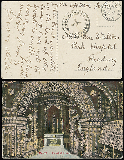 1286 c, entire, etc. imageMalta: World War I: Hospitals, collection incl. 1915 St John Ambulance Association Malata Centre picture postcard used to England, 1915 picture postcard “On Active Service” to Sydney datelined at “Tigne Hospital”, 1915 picture postcard to Sheffield “ON ACTIVE SERVICE/(cross)/MEDTN” cachet, datelined “Ricasoli Hospital” and with A.P.O “S.Z.7” c.d.s., 1916 Church Army Recreation Tent postcard to England with “ON ACTIVE SERVICE/(cross)/MEDTN” cachet etc. (30 cards/covers) (Image1)