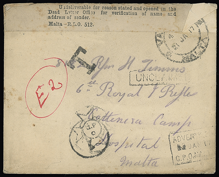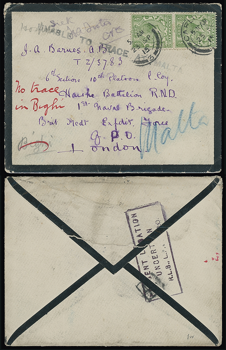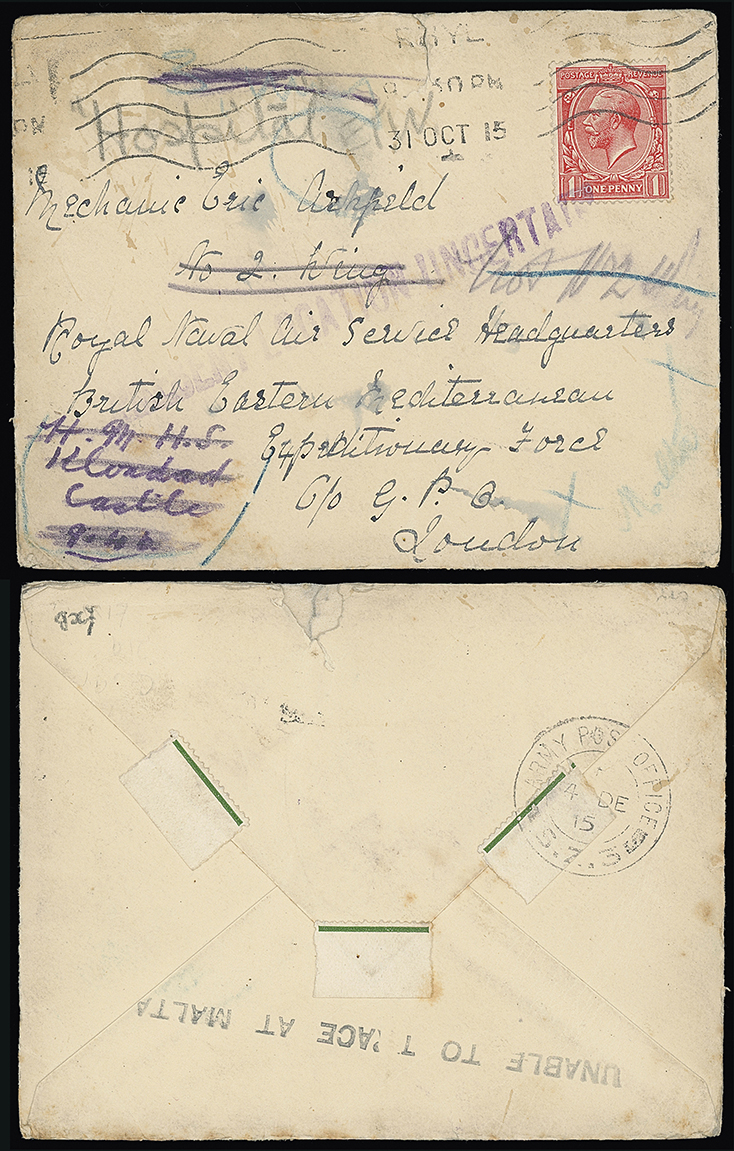 1282 c, entire, etc. imageMalta: World War I: Hospitals, 1915 (Oct. 31) envelope to the Mediterranean Expeditionary Force franked G.B. 1d. tied by Rhyl machine cancellation with A.P.O “S.Z.3” (Imbros) c.d.s., endorsed “Not No. 2 Wing”, redirected to HM Ship “Klonad Castle” then Malta and endorsed “Hospital” with straight line “UNABLE TO TRACE AT MALTA” (on the reverse) and straight line “PRESENT LOCATION UNCERTAIN” marks, dramatic cover. Photo. (Image1)