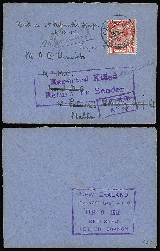 1281 c, entire, etc. imageMalta: World War I: Hospitals, 1915 (Oct. 25) envelope to a private in Malta franked G.B. 1d. tied by “GORING. OXON.” c.d.s. with framed “Reported Killed/Return to Sender”, framed “R.E.(S.R.)/A.P.S.” (Royal Engineers Special Reserve Army Postal Services) on front and a double lined framed “NEW ZEALAND/ADVANCED BASE A.P.O./(date)/RETURNED/LETTER BRANCH” datestamp on the reverse. Further endorsed “Died in St Patricks Hosp.”, another tragic cover. Photo. (Image1)