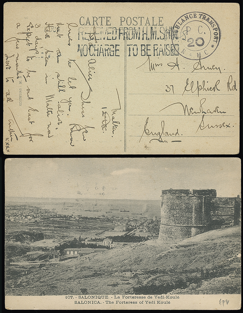 1285 c, entire, etc. imageMalta: World War I: Hospitals, 1918 (Dec. 12) picture postcard datelined “Malta” to England with double ring “AMBULANCE TRANSPORT/P.C/20/R.A.M.C” mark, unusual. Undetermined status but certainly a black hospital ship which may or may not have carried wounded and without the protection of the Geneva Convention. Photo. (Image1)