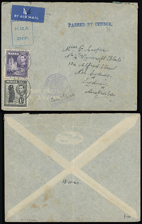1294 c, entire, etc. imageMalta: World War II: 1940 (Nov. 15) airmail envelope to Sydney franked 3d. and 1s. with straight line “PASSED BY CENSOR.”, framed “H.M.A.SHIP.” and tombstone “PASSED BY CENSOR FROM H.M.SHIP” marks. Photo. (Image1)