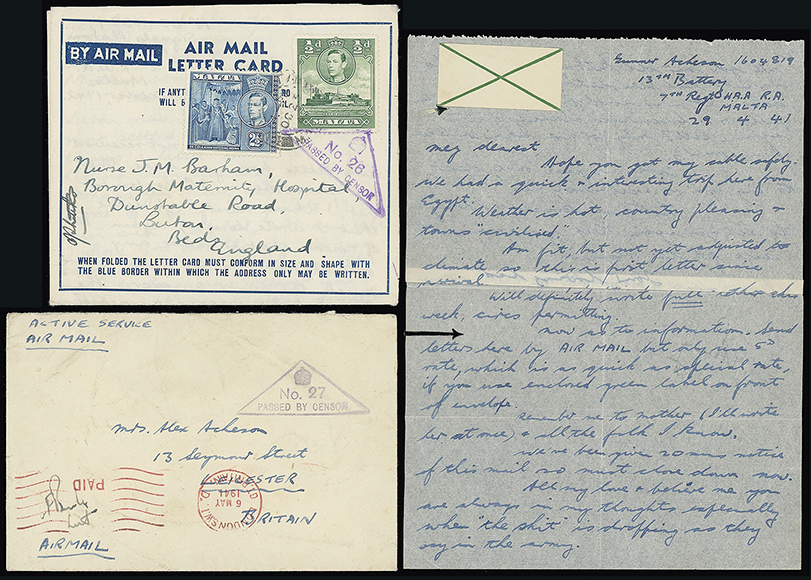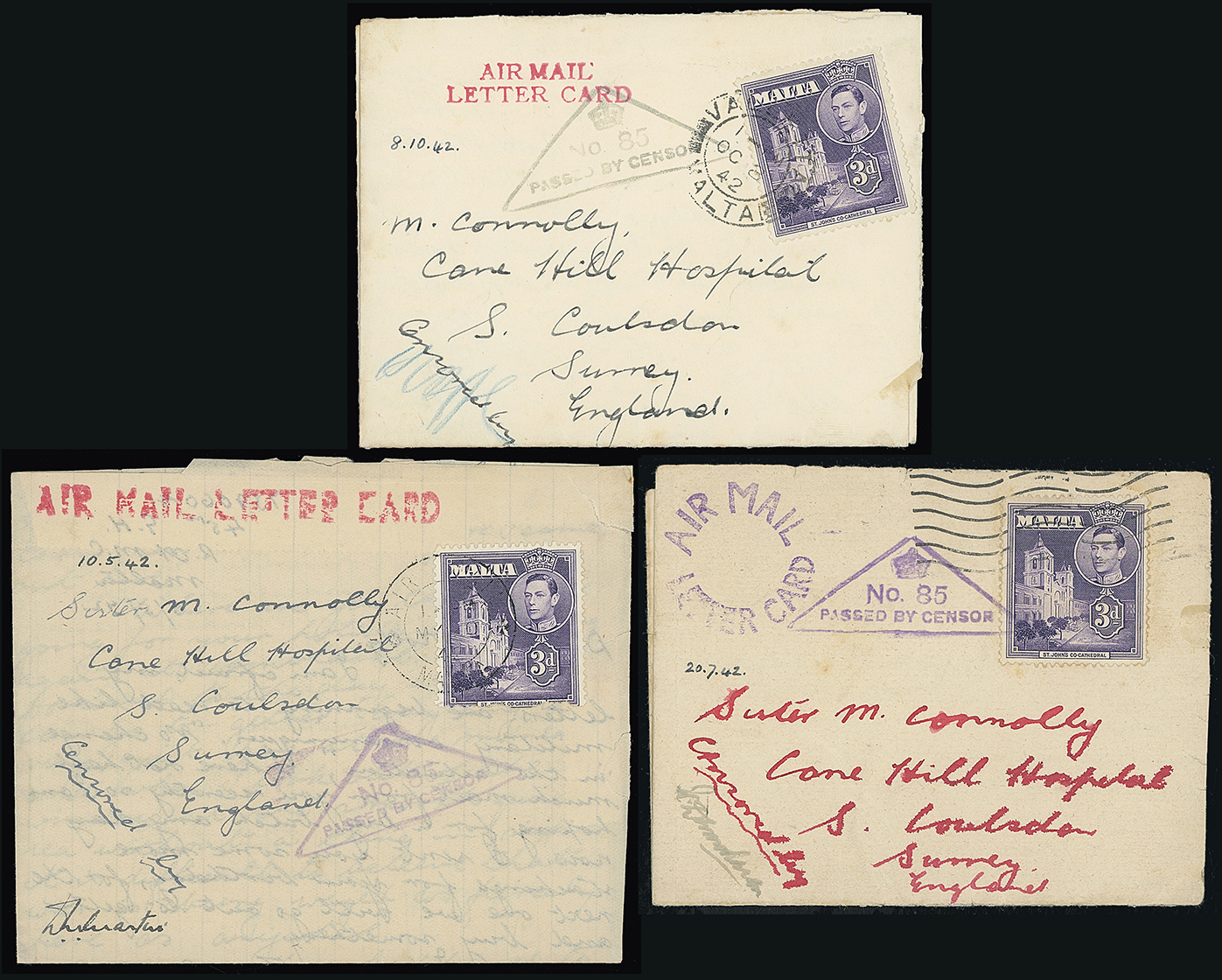 1300 c, entire, etc. imageMalta: World War II: 1942 (May, July and Oct.) improvised lettercards to the same addressee in England each franked 3d. and with “AIR MAIL LETTER CARD” mark in red, circular “AIR MAIL/LETTER CARD” in violet or “AIR MAIl/LETTER CARD” in red marks and each with triangular censor marks. (3 items) (Image1)