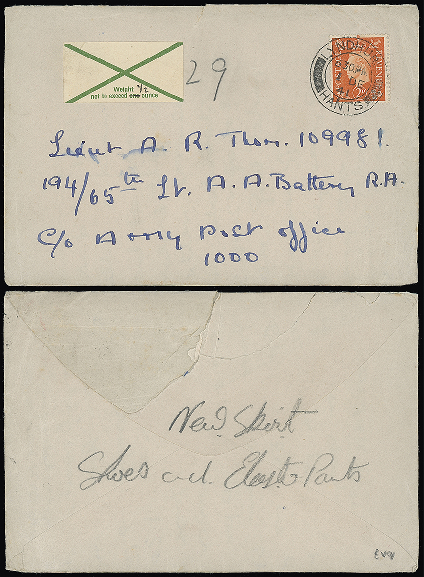1299 c, entire, etc. imageMalta: World War II: 1941 (Dec. 1) envelope to A.P.O., 1000 franked G.B. 2d. tied by Lyndhurst c.d.s. with printed green cross “Weight/not to exceed half ounce”, fine. Photo. (Image1)