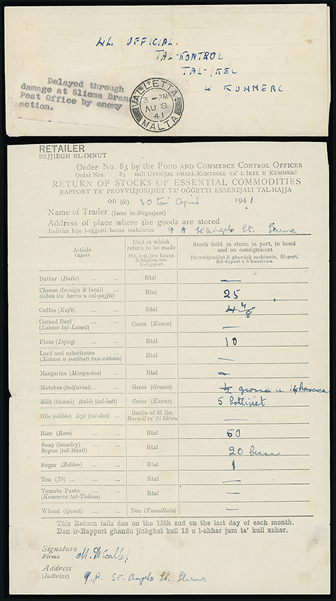 1295 c, entire, etc. imageMalta: World War II: 1941 (Apr. 3) local entire letter (Fortnightly return of essential commodities list by a shopkeeper indicating severe food shortages) with type-written label “Delayed through/damage at Sliema Branch/Post Office by enemy/action.” and tied by Valletta c.d.s. Ex Disraeli. Photo. (Image1)