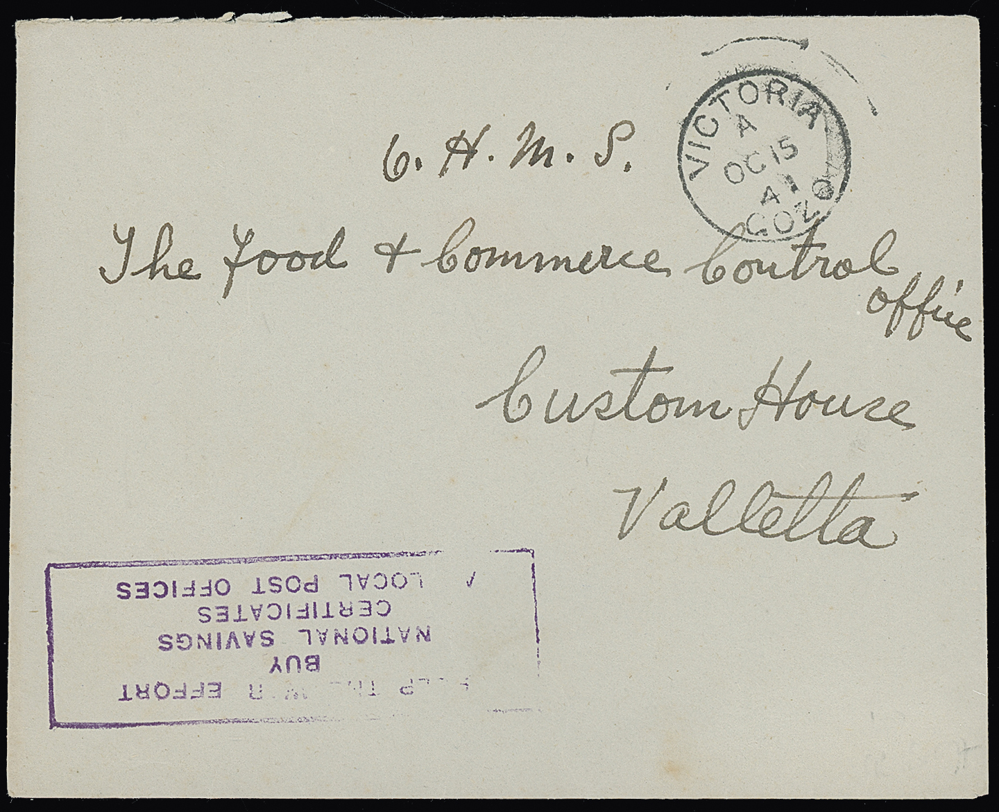1298 c, entire, etc. imageMalta: World War II: 1941 (Oct. 15) O.H.M.S. envelope to Valletta with “VICTORIA/GOZO” c.d.s. and framed “HELP THE WAR EFFORT/BUY/NATIONAL SAVINGS/CERTIFICATES/AT LOCAL POST OFFICES” cachet in purple and only in use in six days, scarce thus. Photo. (Image1)