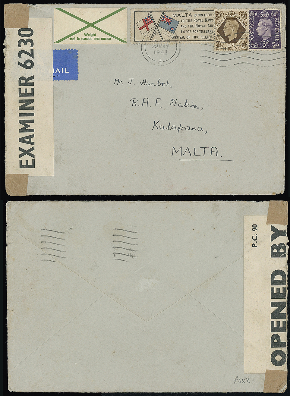 1297 c, entire, etc. imageMalta: World War II: 1941 (May 29) censored airmail envelope to Kalafrana, Malta franked G.B. 3d. and 1s. with perforated “MALTA IS GRATEFUL/TO THE ROYAL NAVY....” label all tied by a Glasgow machine cancellation, very unusual use thus and also with a green cross “Weight/not to exceed one ounce” label affixed. Photo. (Image1)