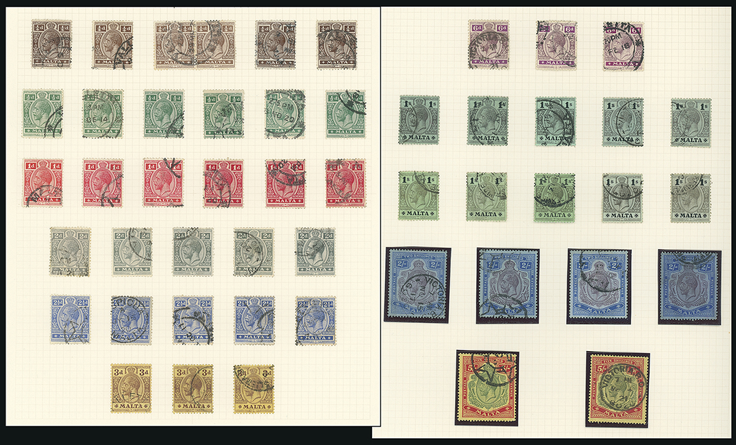 1373 imageMalta: Collections: A K.G.V collection on leaves, incl. 1914-21 used to 5s. (2), 1917-18 War Tax set overprinted “SPECIMEN”, 1921-22 set mint, etc. (236) (Image1)