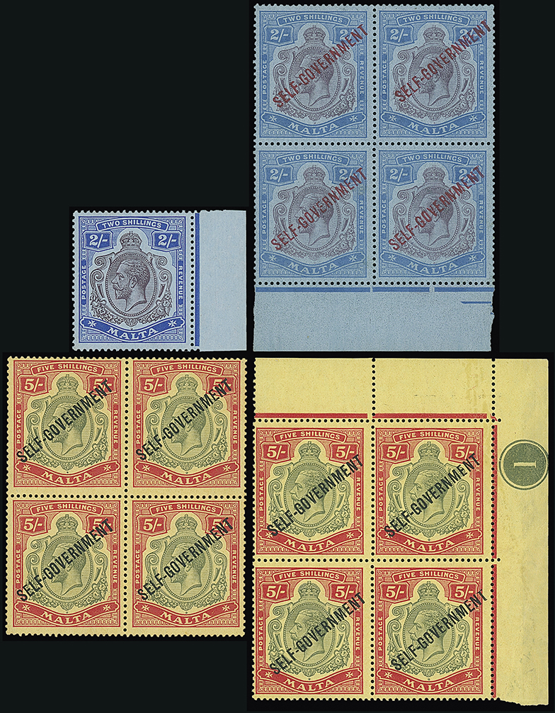1374 imageMalta: Collections: A mainly mint collection of K.G.V high values on leaves, incl. 1914-21 2s. with damaged leaf, 2s. with broken crown and scroll (3), 5s. mint blocks of four (4), singles (8), 5s. with broken crown and scroll (2), 1921-22 Watermark Mult. Script CA 2s. with lines omitted from scroll, 2s. broken crown and scroll (2), 1922 Self-Government, Watermark Mult. Crown CA 2s. lines omitted from scroll (3), 2s. broken crown and scroll, 2s. block of four, one with damaged leaf, 2s. pair, one with broken crown and scroll, 5s. with broken crown and scroll (2), also corner block of four, one with broken crown and scroll, 5s. block of four, one with lines omitted from scroll, etc., varied condition. (70) (Image1)