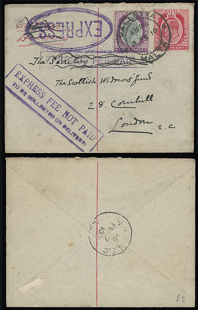 1361 c, entire, etc. imageMalta: Auxiliary Services: 1910 (Feb. 3) envelope “Express/Delivery” to London franked K.E.VII 1d. and 3d. tied by Valletta c.d.s. with oval “EXPRESS”, framed “EXPRESS FEE PAID 3D” and framed “EXPRESS FEE NOT PAID/TO BE COLLECTED ON DELIVERY” mark applied to collect the internal British fee. Exceptionally rare with no other pre W.W.II examples believed to exist. Photo. (Image1)